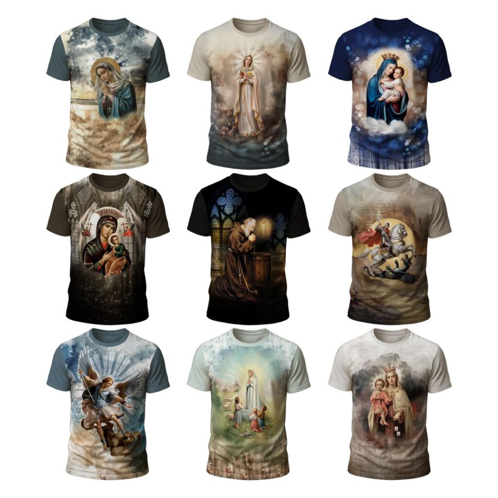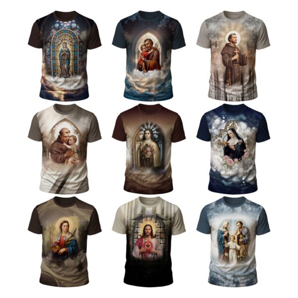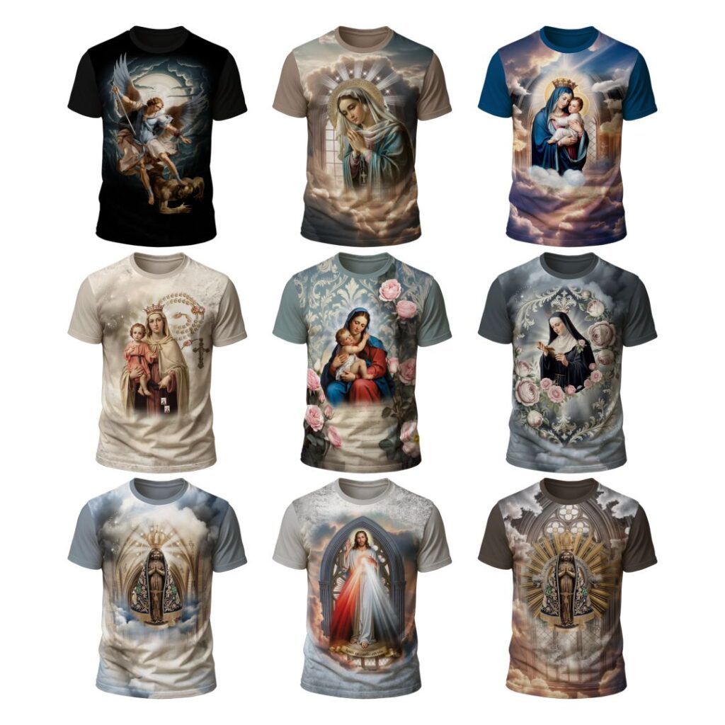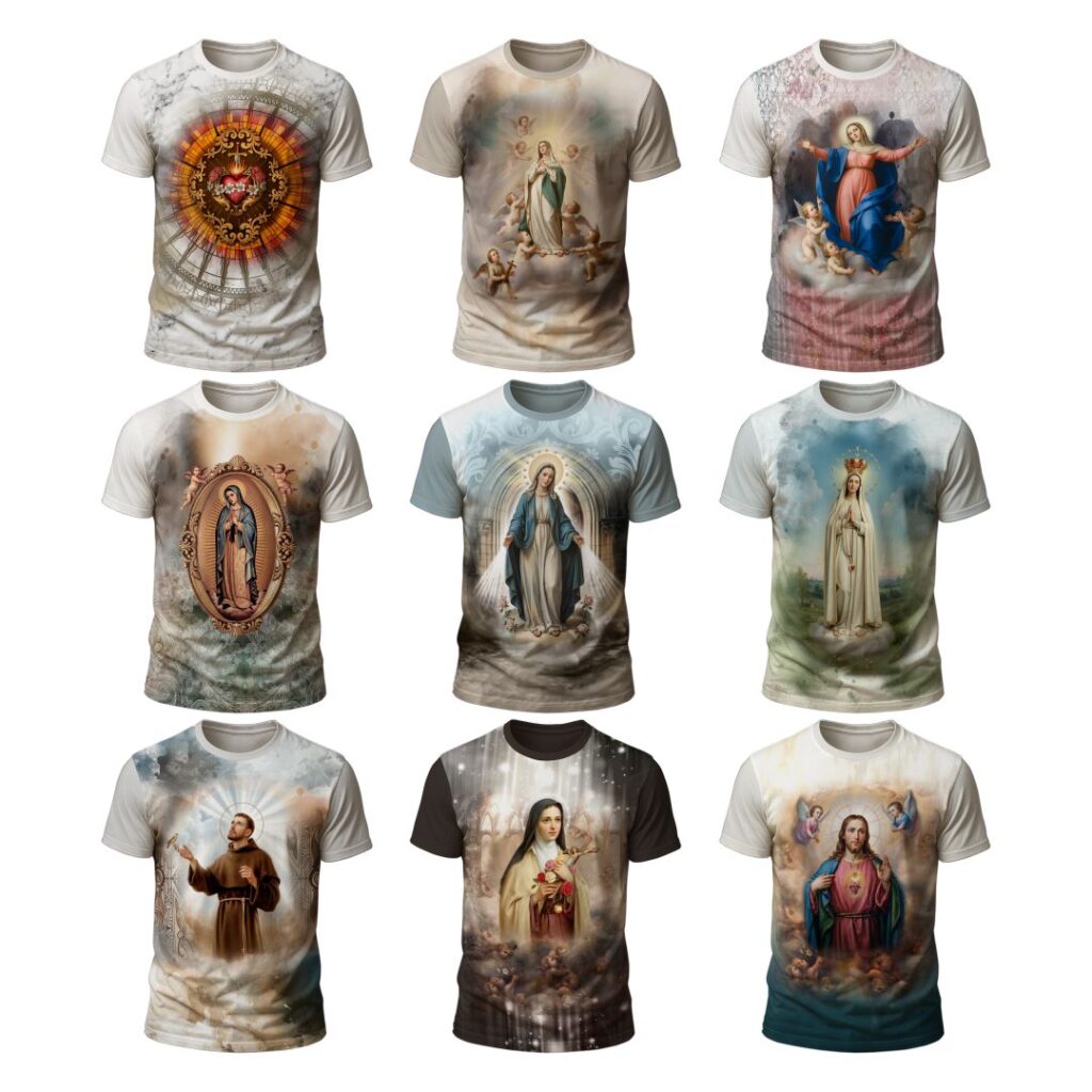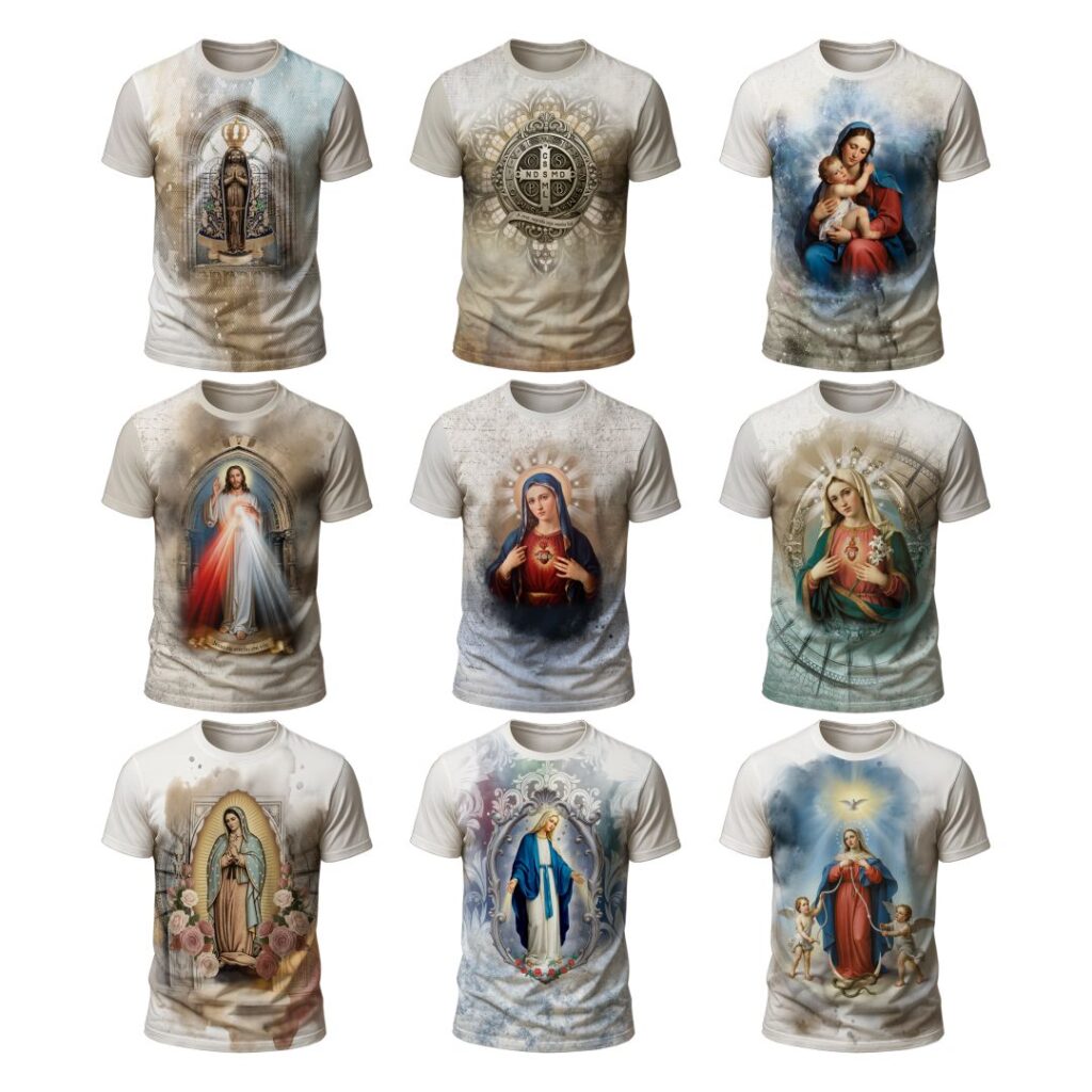 Você vai receber +50 artes católicas prontas para estamparia e personalização de camisas. Todas em alta resolução e 100% editáveis (cores, textos, posição e resolução).